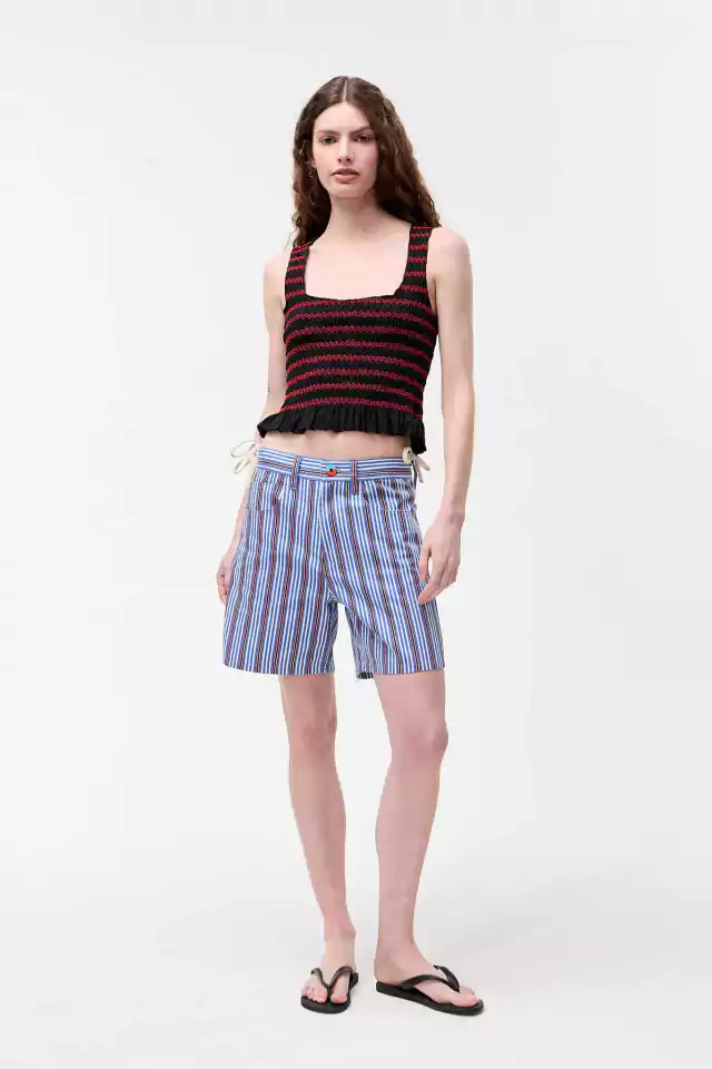 Bermuda de gabardina a rayas, puedes usarlo tanto tiro alto como más bajo en las caderas. Tiene detalle de botón a dos colores en la cintura.