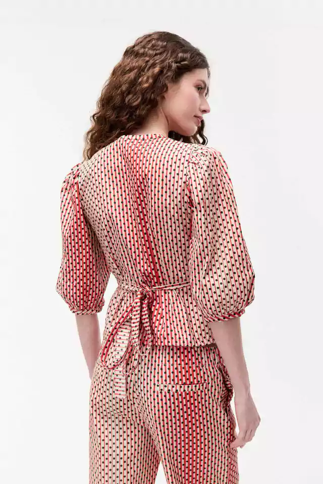 Blusa cruzada con poplin estampado exclusivo y mangas voluminosas. Se puede usar con su short en conjunto.