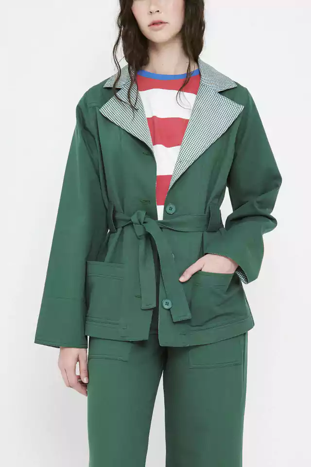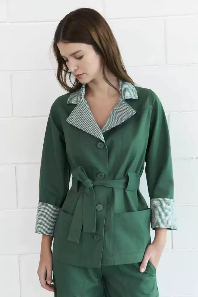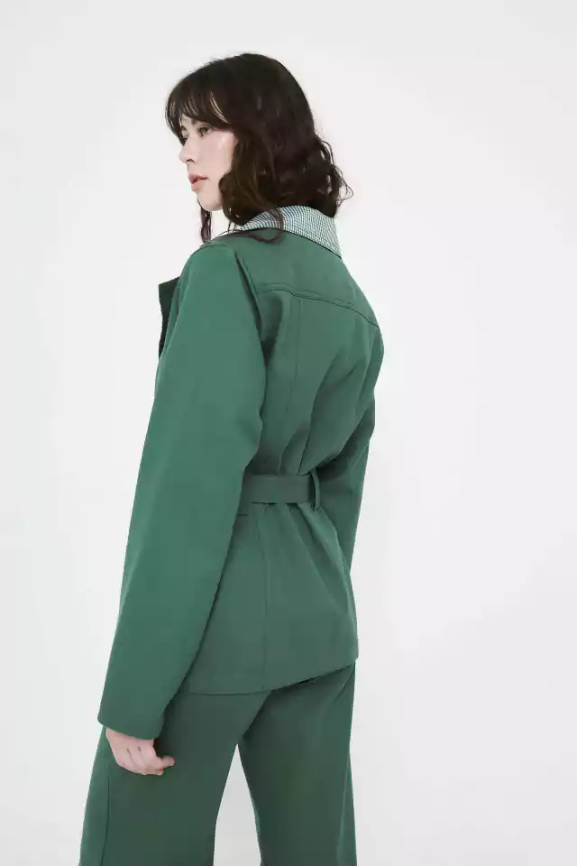 Chaqueta de gabardina verde con cinturón y costuras estilo jeaneras a tono. Solapas en cuadros verde. Podes usarlo con su pantalón en conjunto.