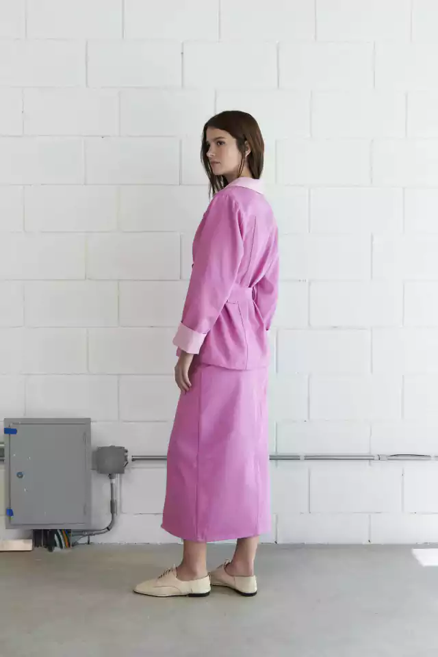 Chaqueta de gabardina rosa con cinturón y costuras estilo jeaneras a tono. Solapas en cuadros rosa. Podes usarlo con su falda en conjunto.