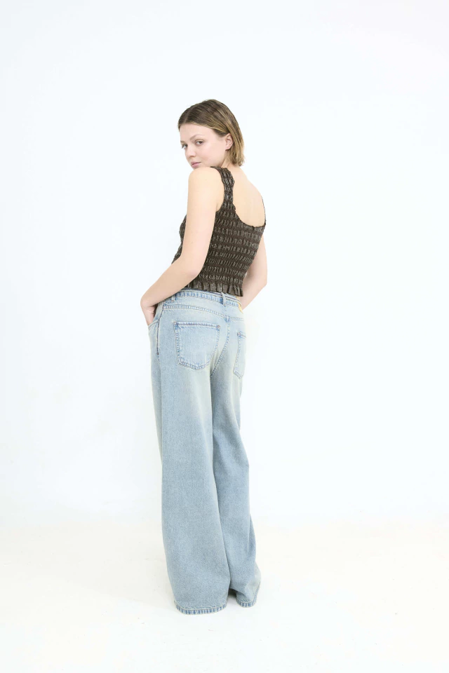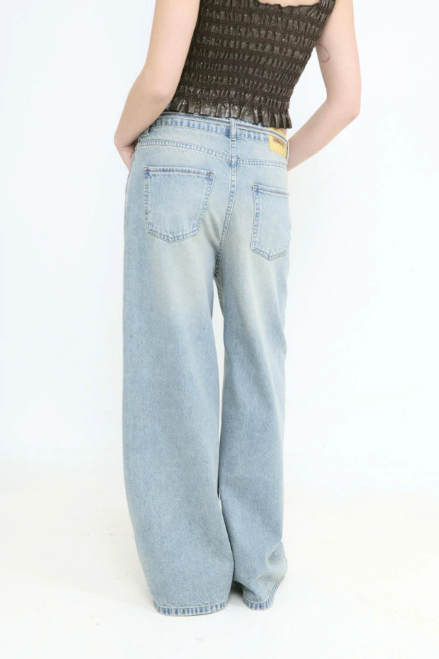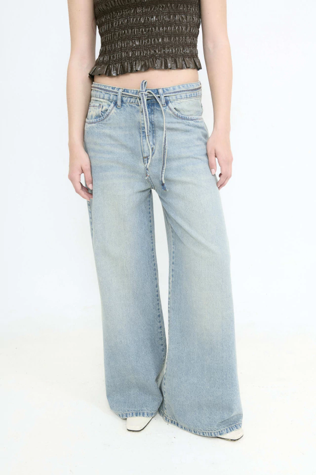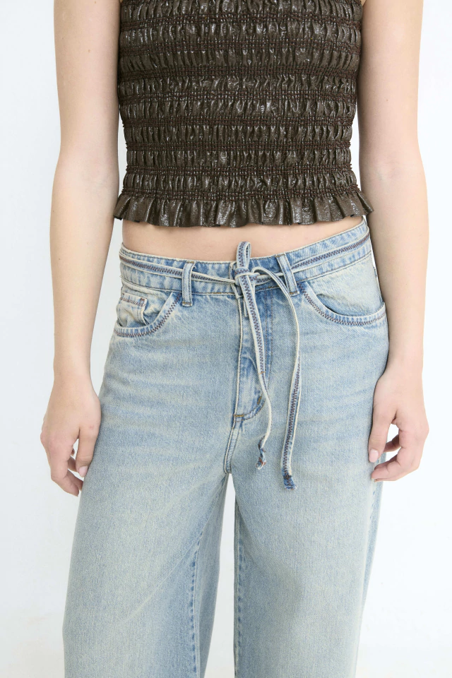 Pantalón denim celeste fit oversize con detalle de bordado en zigzag chocolate en los bolsillos delateros y traseros. Incluye una tira denim opcional para ajustar la cintura con bordado zigzag chocolate.