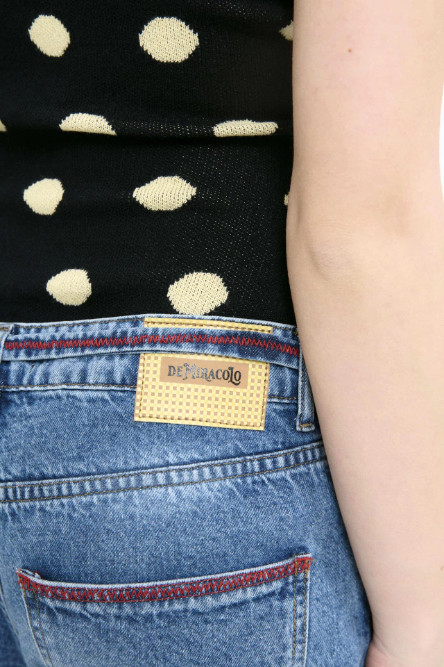 Pantalón denim azul fit oversize con detalle de bordado en zigzag rojo en los bolsillos delateros y traseros. Incluye una tira denim opcional para ajustar la cintura con bordado zigzag rojo.