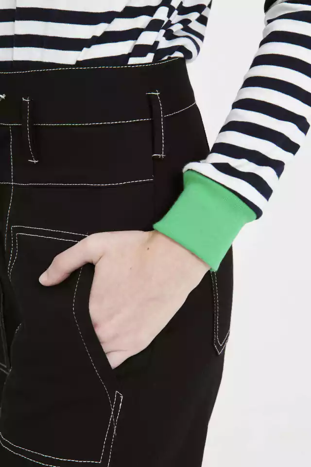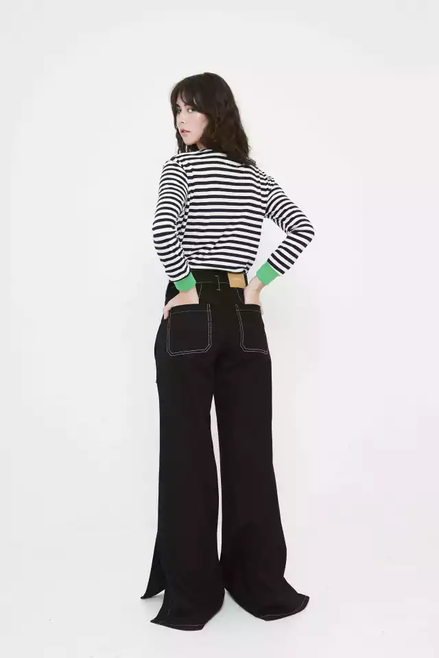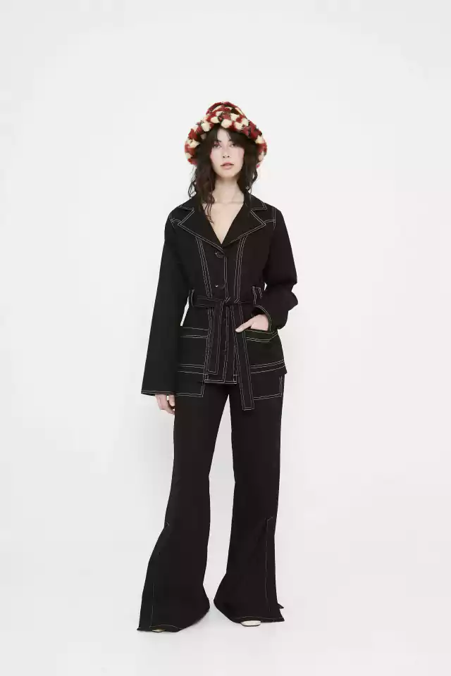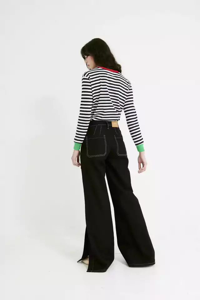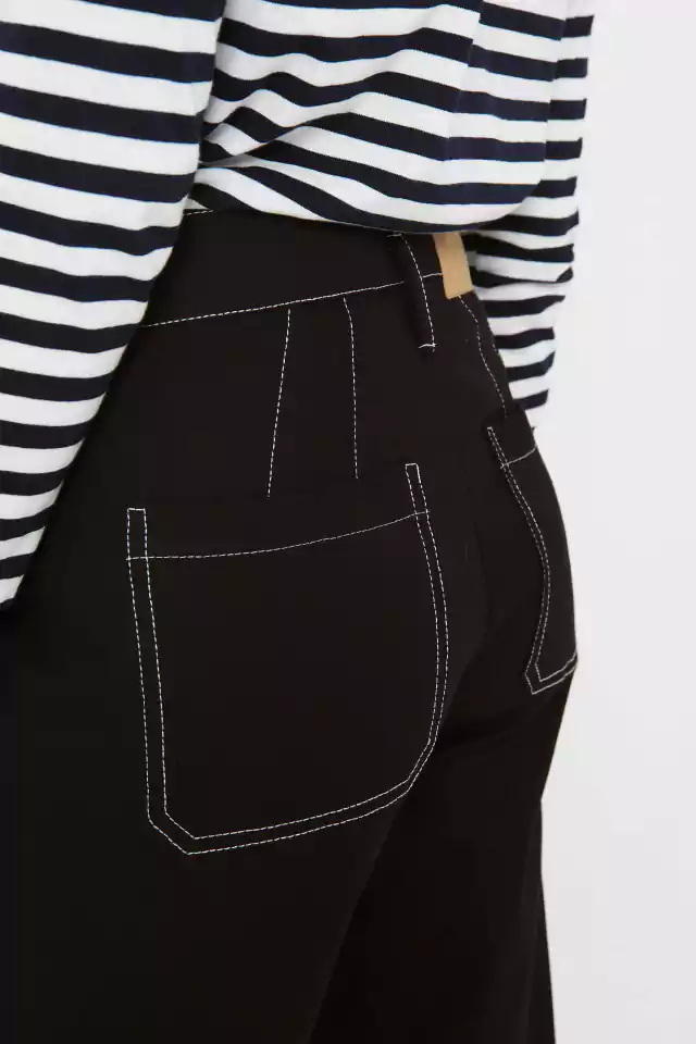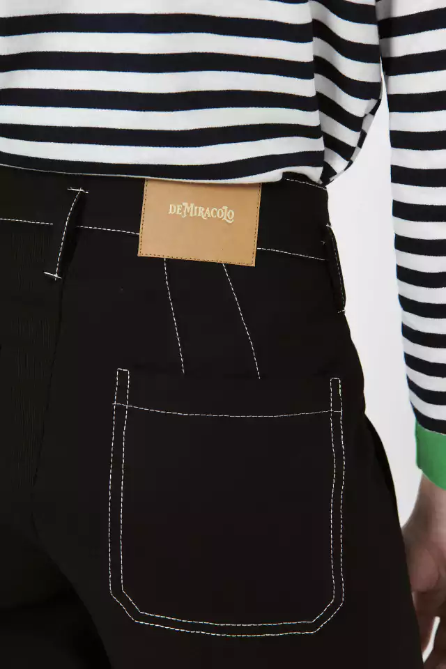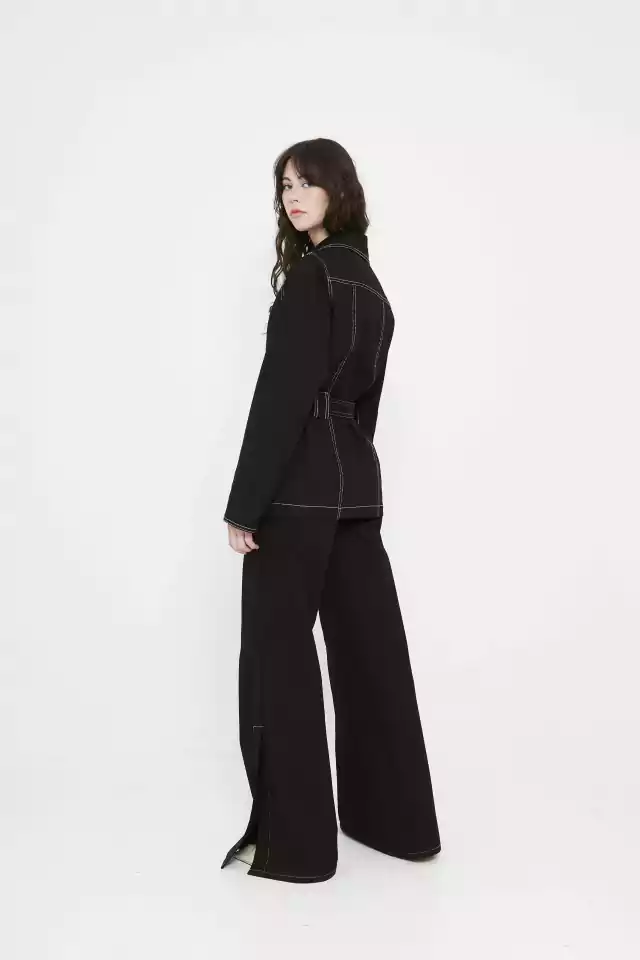 Pantalón de gabardina negro, con costuras estilo jeaneras a contra tono. Bolsillos delanteros y traseros. Abertura en bota manga. Podes usarlo en conjunto con la chaqueta :)