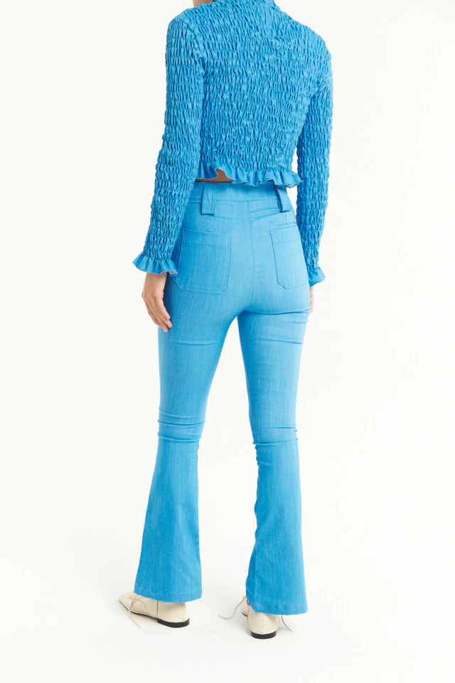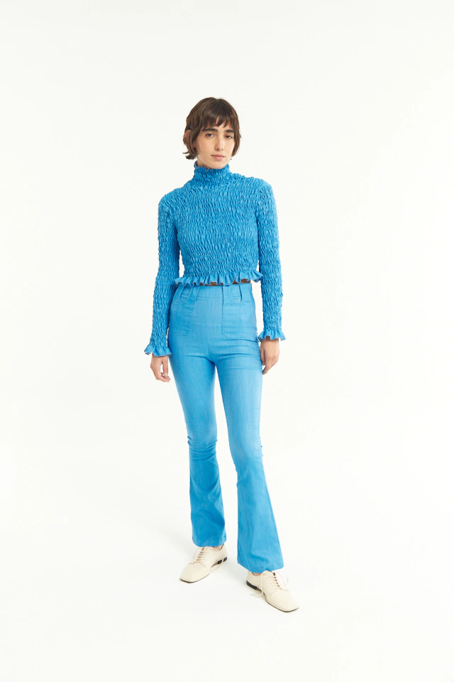 Pantalón en bengalina celeste, con spandex, bolsillos delanteros y pasadores, tiro alto.