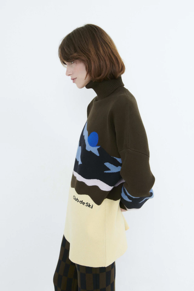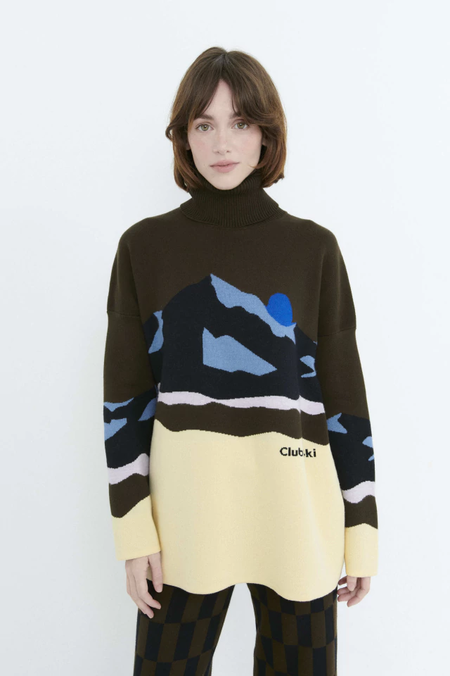 Sweater estilo polerón, jacquard marrón 100% algodón con dibujo de montaña con colores en los tonos azules, rosa claro y vainilla. "Club de Ski" en la parte inferior izquierda.
