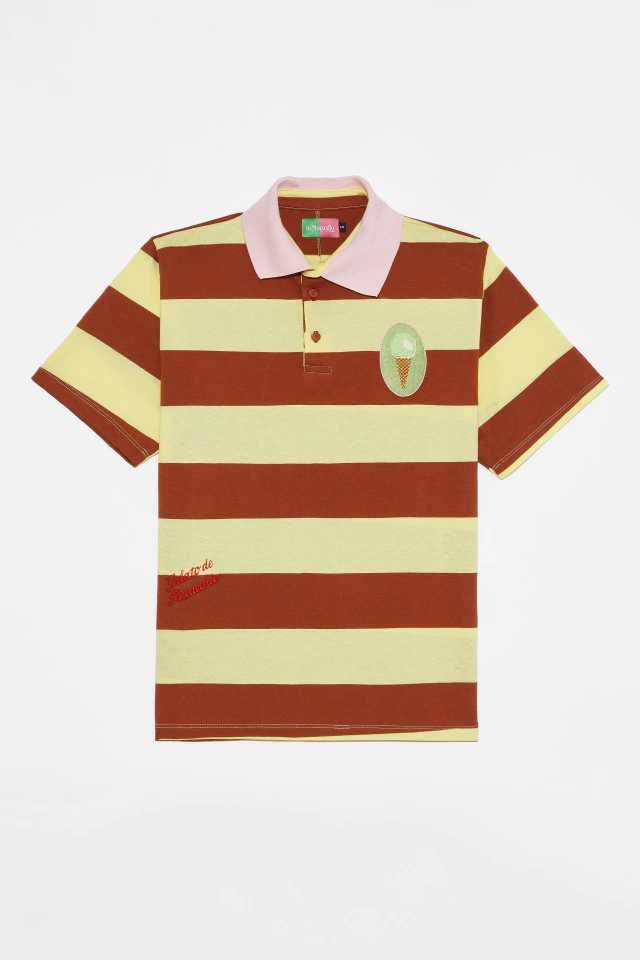 Chomba de algodón, 100% algodón, con bordado tipo escudo de helado de pistacho y frase italiano en rojo bordada en borde derecho.