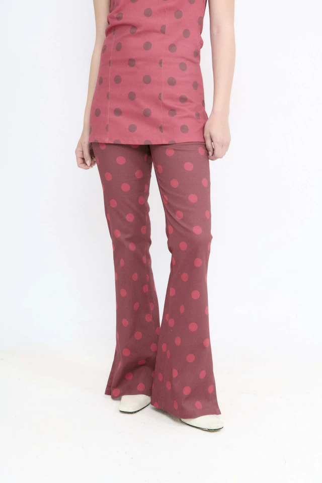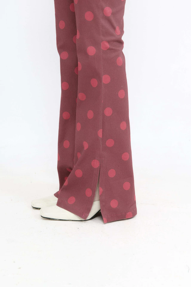 Pantalón de gabardina con spandex bordo con lunares rojos, tiro medio. Con cierre. Aberturas en los laterales inferiores.