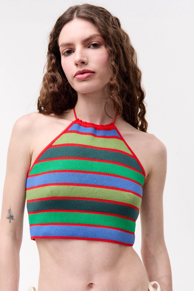 Top a rayas de colores, atado al cuello con espalda descubierta.