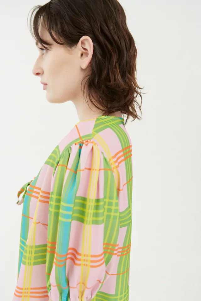 Top de seda estampada con tiras ajustables y mangas voluminosas con elastico.
