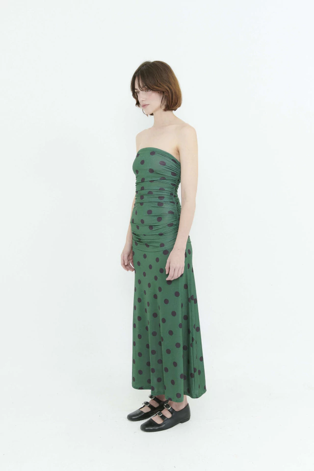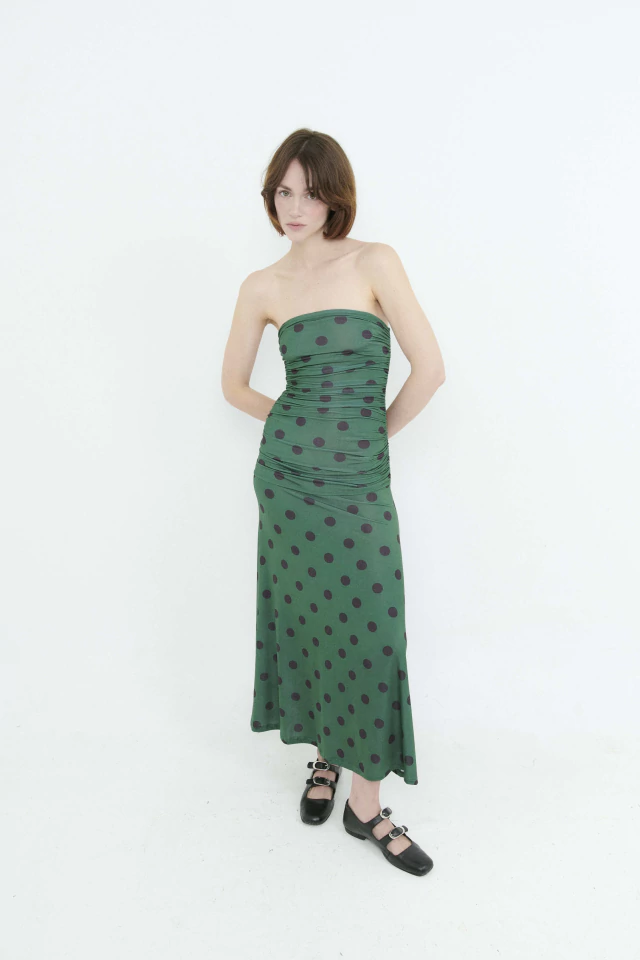 Vestido de lycra verde petróleo con estampado de lunares en negro. Se adapta a tu cuerpo, con frunces laterales que realzan la figura. Elegante y versátil, ideal para cualquier ocasión.