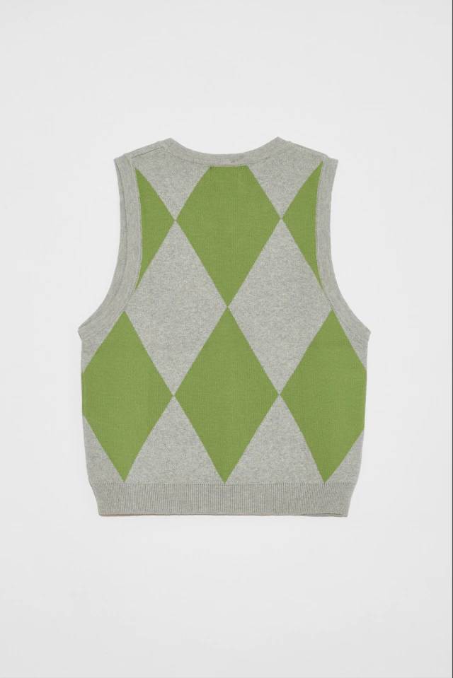 Chaleco jacquard con rombos grises y verdes, 100% algodón, con cuello gris.
