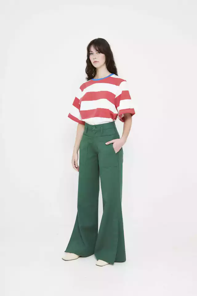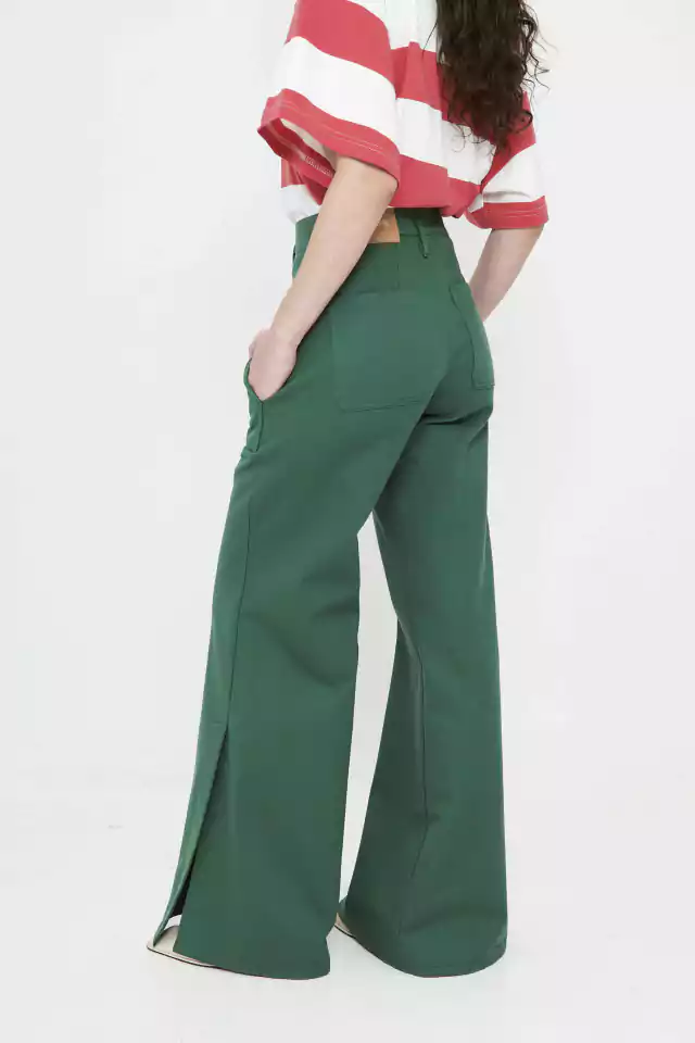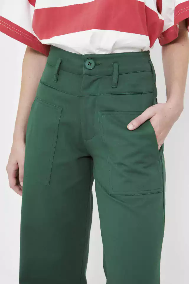 Pantalón de gabardina verde, con costuras estilo jeaneras a tono. Bolsillos delanteros y traseros. Abertura en bota manga. Podes usarlo en conjunto con la chaqueta :)