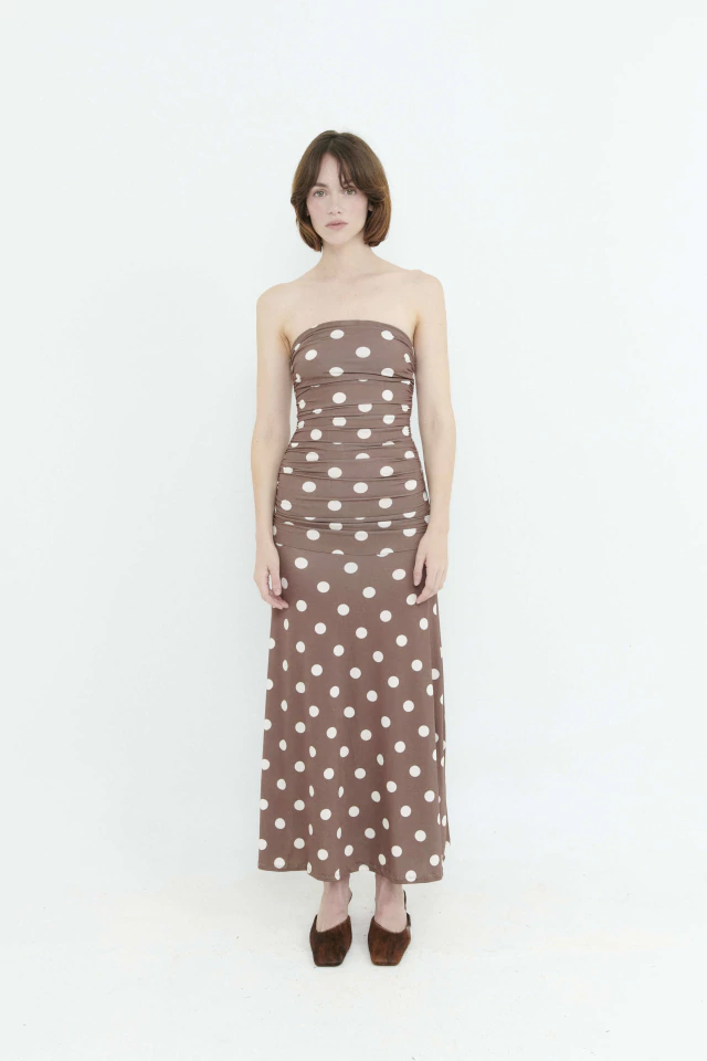 Vestido de lycra marrón con estampado de lunares en blanco. Se adapta a tu cuerpo, con frunces laterales que realzan la figura. Elegante y versátil, ideal para cualquier ocasión.