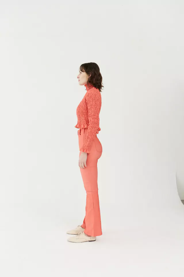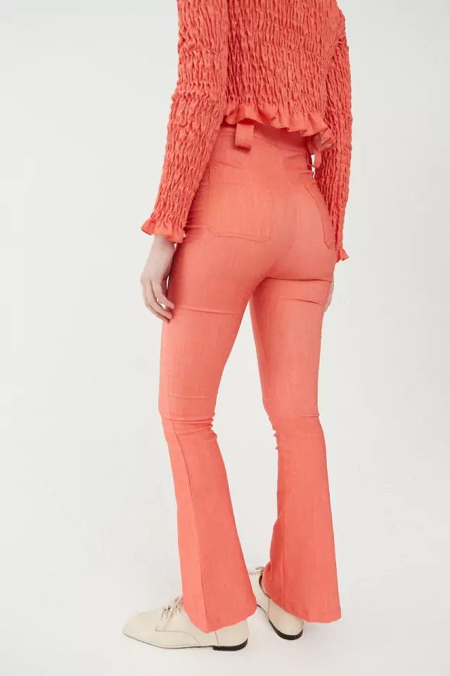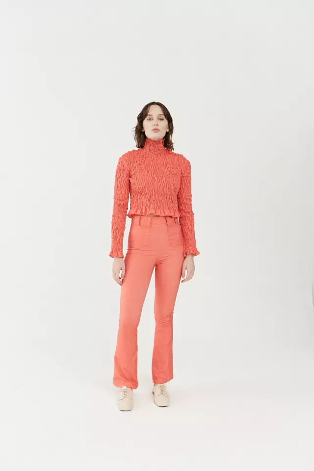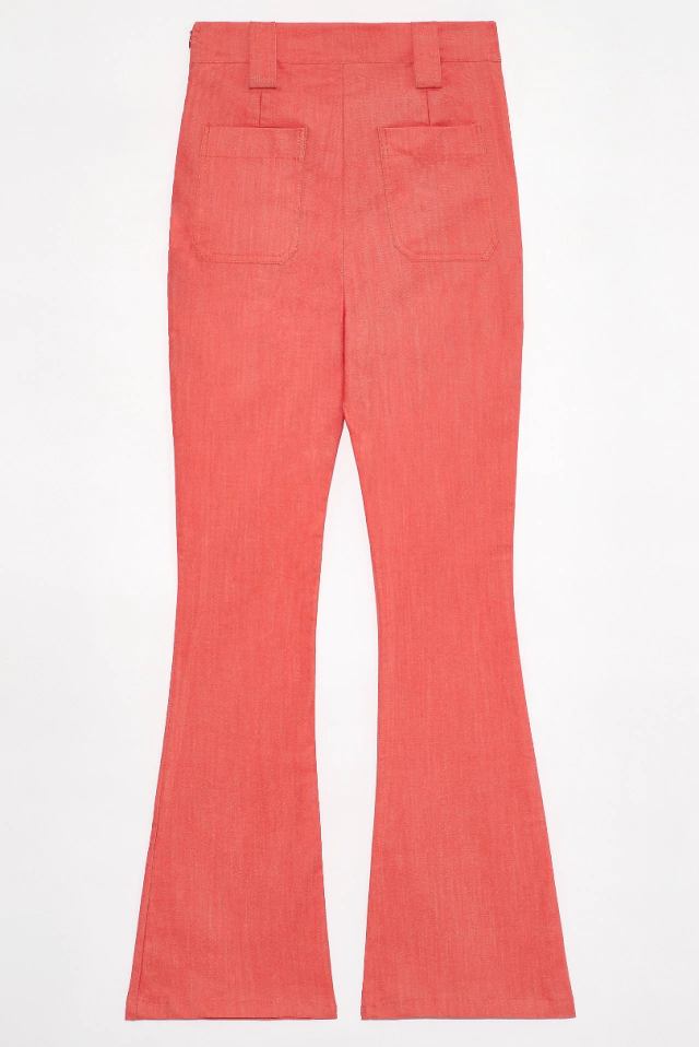 Pantalón en bengalina roja, con spandex, bolsillos delanteros y pasadores, tiro alto.