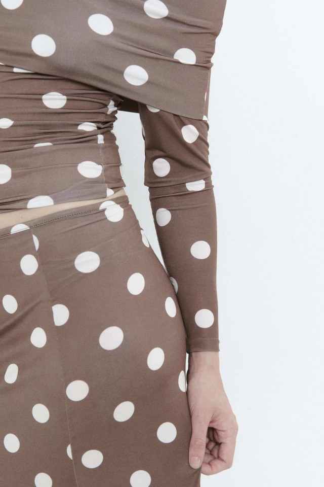 Vestido de lycra marrón con estampado de lunares en blanco. Se adapta a tu cuerpo, con frunces laterales que realzan la figura. Elegante y versátil, ideal para cualquier ocasión.