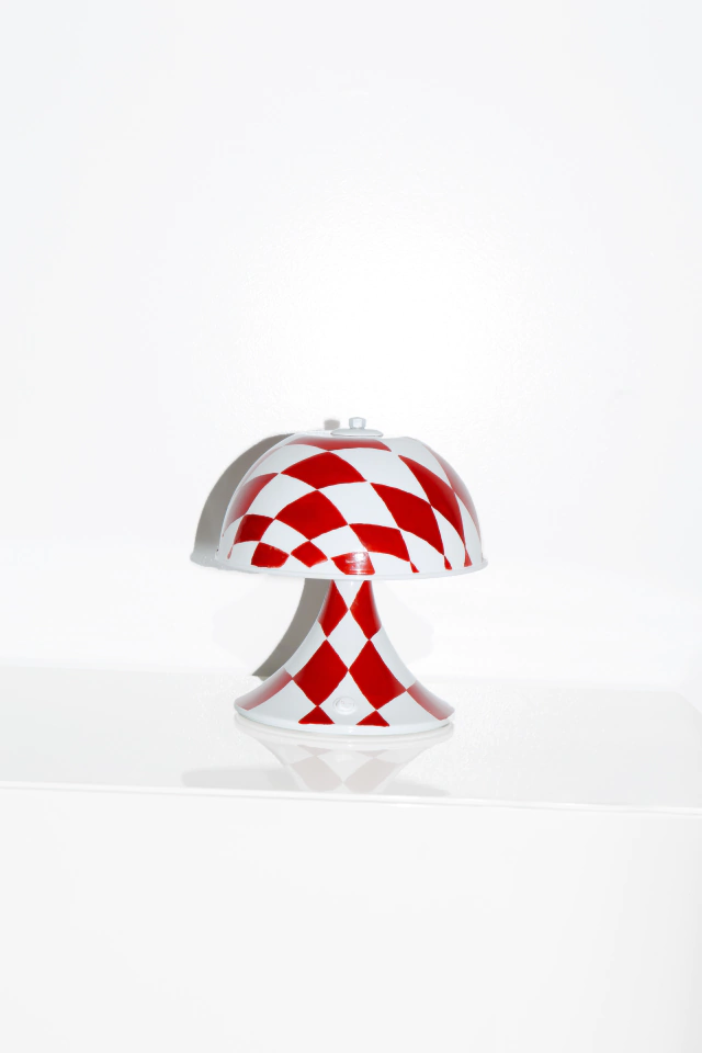 Velador personalizado, pintado a mano. La base del velador es blanca y los rombos se pintaron en rojo adaptandose a la forma del mismo.